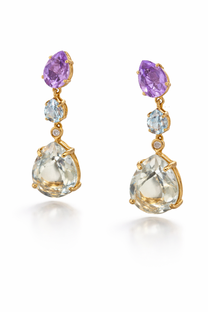 Artur Scholl oorstekers Brilj. 0.04 ct W/VVSi, green amethyst 6.20 ct, blue topaz 1.0 ct, amethyst 1.48 ct