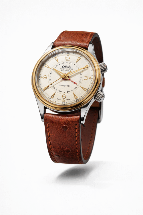 Een zeldzaam, volledig origineel en verzamelwaardig Oris-horloge, waarin klassieke Zwitserse techniek en een bijzondere alarmcomplicatie samenkomen.
