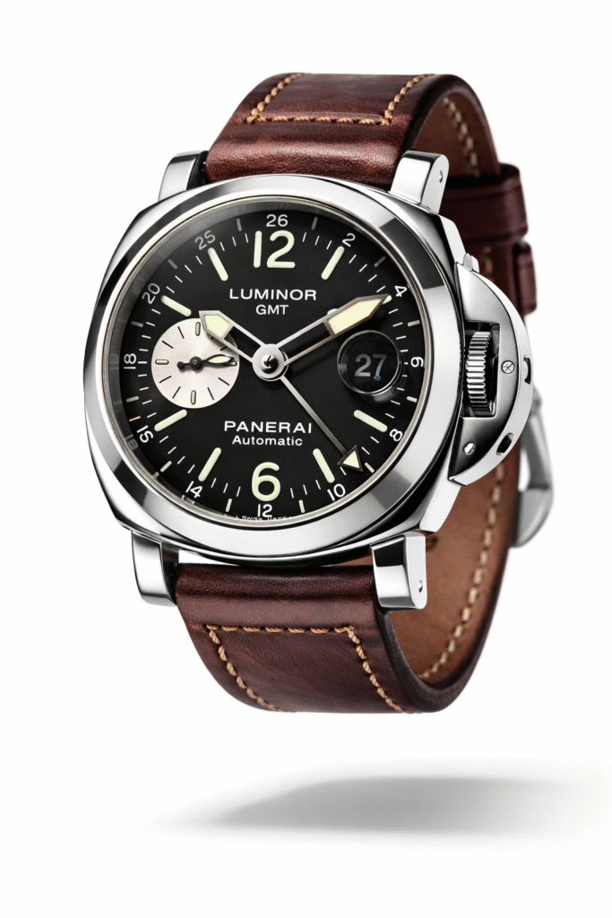 De zwarte wijzerplaat met lichtgevende indexen, de iconische kroonbrug en de praktische GMT-functie maken dit model geliefd bij liefhebbers die Panerai waarderen als instrumenteel horloge.