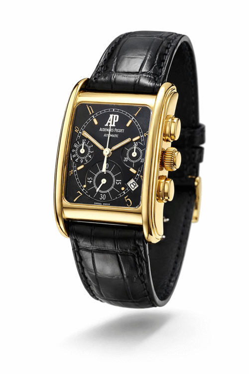 Dit elegante Audemars Piguet Edward Piguet herenhorloge is een verfijnd voorbeeld van klassieke haute horlogerie uit het begin van de 21e eeuw. De iconische rechthoekige kast, gecombineerd met een zwarte wijzerplaat en een complexe chronograafindeling, geeft het horloge een uitgesproken en tijdloos karakter.